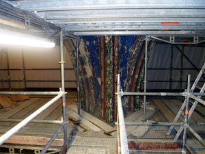 Le programme de restauration a débuté par la révision de l’étanchéité de la couverture, revêtue comme le chœur de plaques de plomb, et par l’amélioration de l’écoulement des eaux pluviales. La première étape visible du chantier fut la dépose des grilles en novembre 2011.