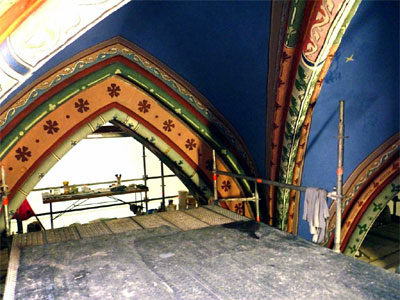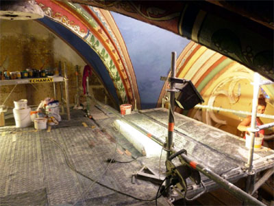 Malgré les dégradations, de nombreux décors peints étaient encore bien conservés. Ils ont servi de référence précieuse pour les équipes de restauration. Les vitraux, quant à eux, ont été simplement nettoyés après inspection, leur état étant jugé satisfaisant.