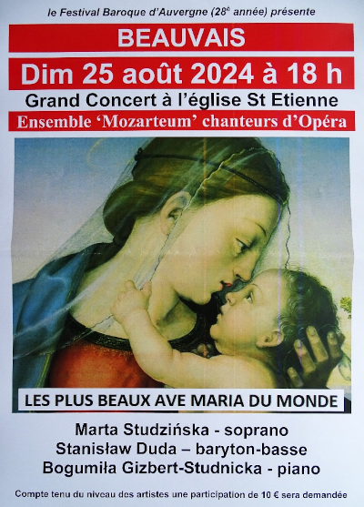 Le dimanche 25 août à 18h (durée : 2h), dans l’église Saint-Etienne de Beauvais, l’Ensemble Mozarteum interprétera une sélection des plus belles compositions de l’Ave Maria, incluant des œuvres de Bach/Gounod, Schubert, Donizetti, Cherubini, Franck et Verdi.