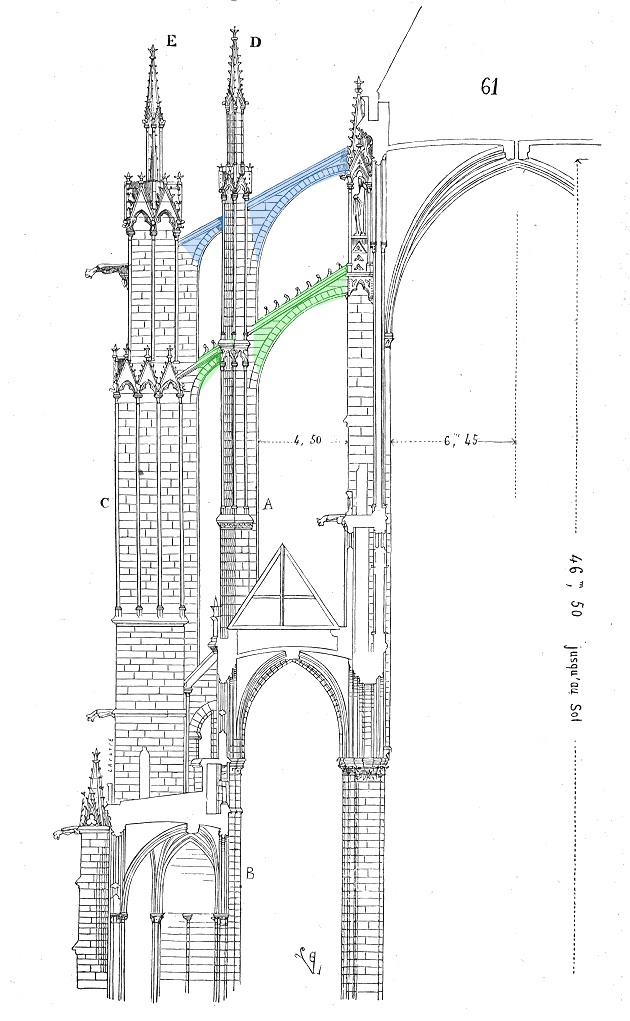À la cathédrale Saint-Pierre de Beauvais, les arc-boutants se distinguent par leur double volée superposée. Les arcs-boutants supérieurs (en bleu), en plus de leur rôle structurel, intègrent des gargouilles et des chéneaux pour évacuer les eaux de pluie, protégeant ainsi les fondations et les façades.