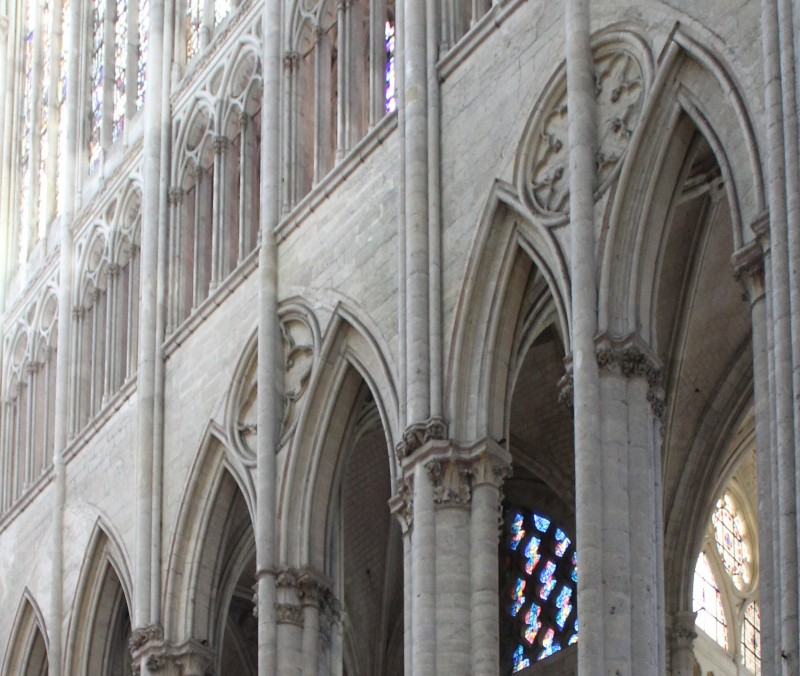 Après l’effondrement partiel des voûtes en 1284, le chœur de la cathédrale de Beauvais a été remanié, notamment par l’ajout de piliers intermédiaires. Ces modifications ont eu pour effet d’ajouter des écoinçons en dessous des écoinçons d’origine, dont certains sont ornés de motifs en polylobes, typiques de l’art gothique rayonnant.